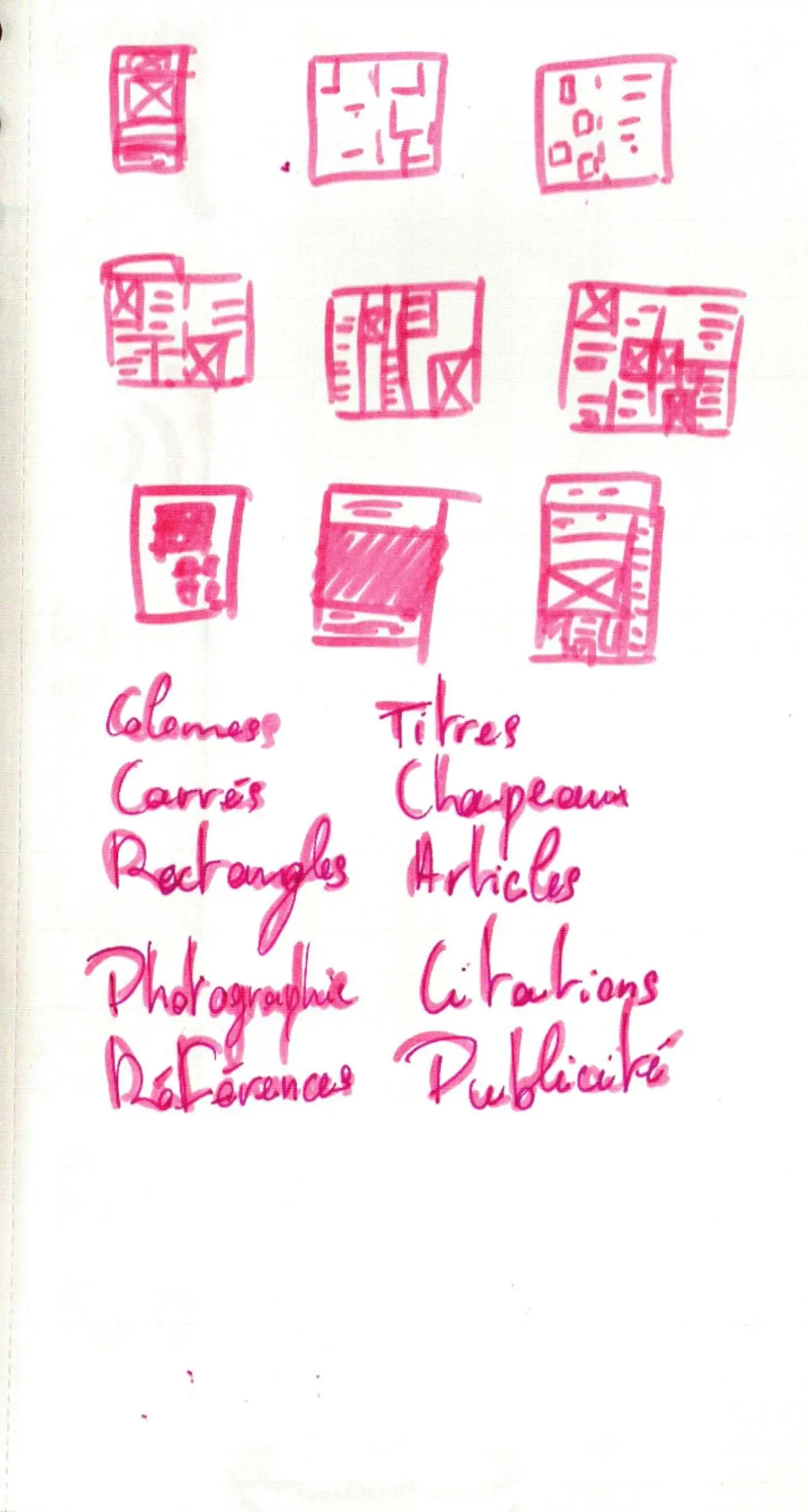 Je souhaitais m'éloigner le plus possible du format traditionnel des journaux où le retrouve beaucoup de texte noir sur fond blanc, mais tout en gardant l'aspect très linéaire vertical de la rédaction. Cette particularité serait appliquée aux articles d'une page minimum.